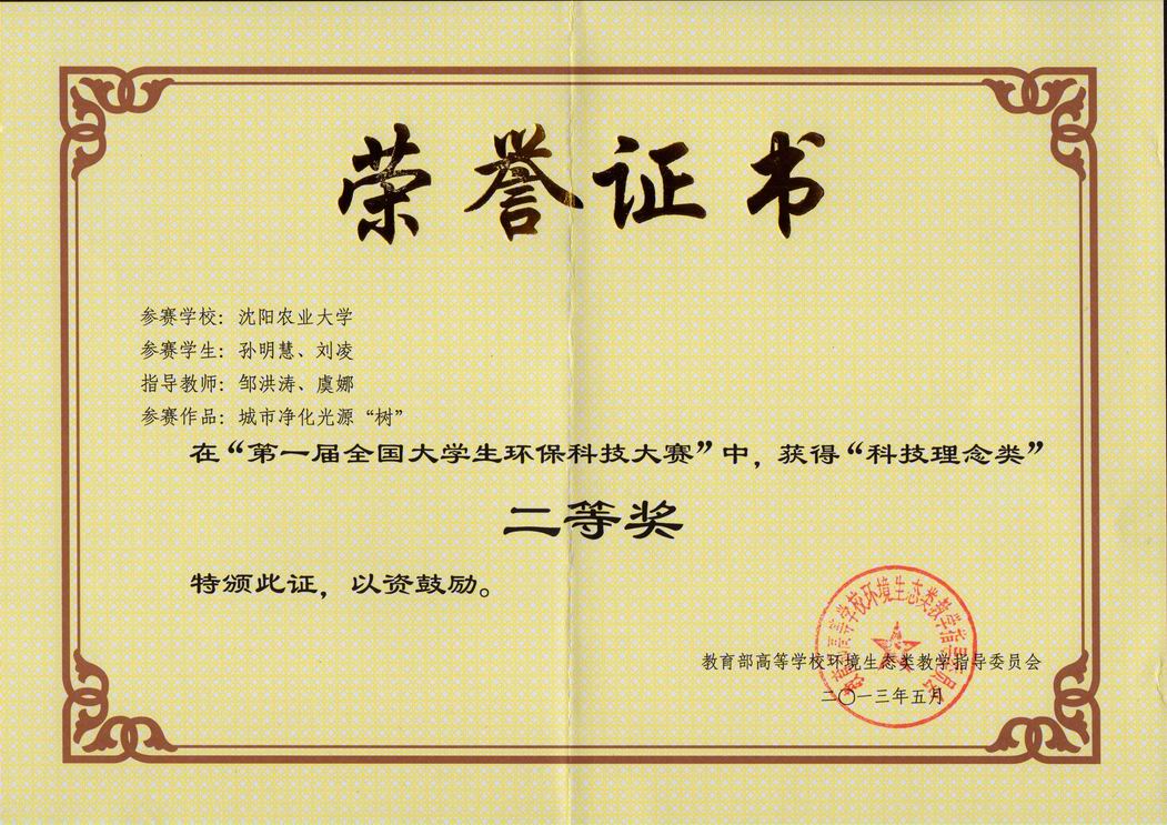 5月31日,第一届全国大学生环保科技大赛在北京林业大学落下帷幕,我院两件参赛作品均获得二等奖,分别是由刘鸣达老师指导的2010级环境科学专业梁佳、2009级环境科学专业张胜完成的“沈阳市东陵公园森林生态系统服务功能价值评估”,以及由邹洪涛老师指导的2010级环境科学专业孙明慧、2010级环境工程专业刘凌完成的“城市净化光源‘树’”。